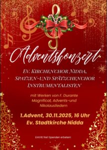 Herzliche Einladung zum Adventskonzert mit dem ev. Kirchenchor Nidda, dem Spatzen- und Spätzchenchor und Intrumentalisten am Sonntag, den 30.11.25 um 16 Uhr in der Ev. Stadtkirche Nidda.
