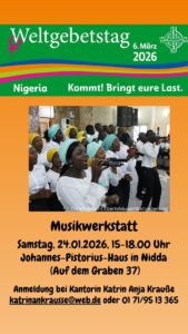 Am Samstag den 24.1.26 findet von 15-18 Uhr im Johannes-Pistorius-Haus in Nidda (Auf dem Graben 37) eine Musikwerkstatt für den Weltgebetstag der Frauen (am 6.3.26) statt.